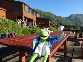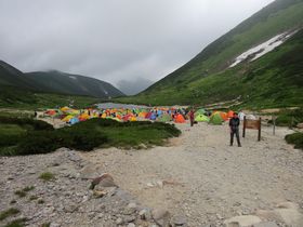 15:05、やっと、双六キャンプ場に到着しました。 ここのキャンプ地は砂場で広くて、おまけに池がそばにあって、なかなかいい雰囲気!トイレは男女兼用で個室が6室ぐらい、水は無料。水場は蛇口が3か所ありましたが、水が雨水利用なのかチョロチョロでした・・・ 私は飲みませんが、小屋では生ビールが飲めます。みんなジョッキ片手に乾杯していました。