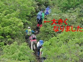 この山は、ここ山頂まで広い場所がなく、休憩したくてもリュックを下ろすのを躊躇しました。 百名山はそれなりに整備されて、ベンチがあったり、ちょっとした休憩場所があるのだけれど、この山はなくて珍しい。土砂崩れの影響で、正規のルートでないから??