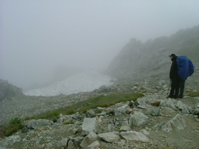 内蔵助カール雪渓の辺りでしょうか?カエルのような鳴き声に立ち止まる人。カエルがこんなところにいる訳ないし・・・