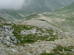 剱沢小屋とキャンプ場が見えてきました。あのキャンプ場を過ぎてあと1時間で、本日のお宿、剱山荘!