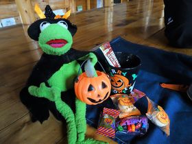 今回はハロウィンバージョンのカーミット。黒いカボチャの絵が描いてあるカップはKALDIでゲット。