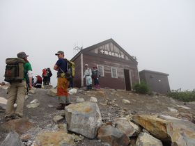 麻子夫妻は「私たち、歩くの遅いです!」なんて言っていたけれど、いい調子で登って行きます。今日は私たちは日帰りの荷物なのに、ペースが上がらず。 やっと避難小屋に到着。上から来る人の話だと、上は晴れているとか。本当かな?!