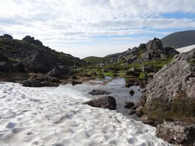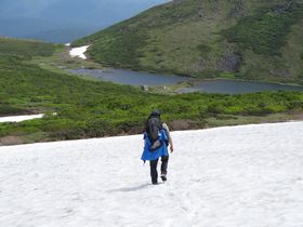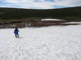 本日いちばんヒヤヒヤポイント、ヒサゴ沼避難小屋までの雪渓下り。 雪渓のどの地点から夏道に入るのかがわからない・・・避難小屋は見えているのに、どうやって行けばいいかわからない・・・本州なら前を歩く人、後ろから来る人、たくさんいるのに北海道は登山客が少ない。この時間なら、後ろから人が来るかもしれないけれど、いつ来るのか・・・やはり、自力で行くしかない。