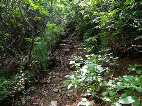前トム平からコマドリ沢分岐までは、かなり雪渓が残っていました。 麻子ご主人にこの写真を見せたら、「こんなに雪が残ってるんだ!」と驚いていました。雪渓を下り、03年に開設した新しい登山道を登ります。