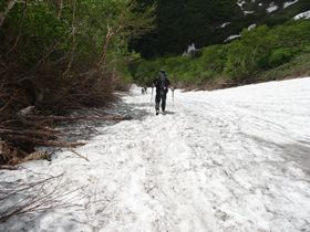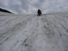 こんな雪渓を何度も渡ります。斜度がないので恐くないです。