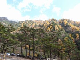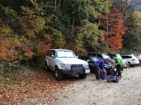 もう少し上にも駐車場あるかもだけど、3連休2日目、この時間なので有明荘上の駐車場に止めました。この辺は紅葉がきれい!!