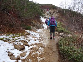 昨日、燕山荘に電話して、登山道の状態を聞いたときに、 「三角点より上のところで少し雪が残ってます」とのことでしたが、この程度でした。 軽アイゼンを持って行きましたが、出番なし。真っ白な雪の山の見てみたいなぁ〜