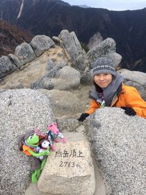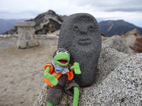 今回、日帰りザックだったのでちょうどいいポケットもあり、カーミットは顔出し! 後ろから来る人、すれ違う人に「かわいい!」と言われると、嬉しい♪ Hくん友人Sさんは、ピンクパーサーが相棒。同じくザックの中から顔出し中。最近、相棒を連れて登山している人が多いです。 ちなみに山ガールは3人とも紫のザックです。私がdeuterで、2人はkarrimorの大きさ違い。