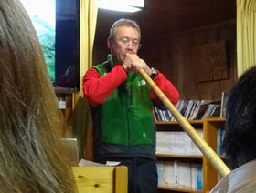 夕飯の後は、燕山荘のご主人赤沼さんから燕岳の魅力と登山についてお話がありました。冬山登山教室、参加したくなりました。いちばん雪深い景色を見たければ4月・・・2月じゃないのは、意外でした。あと雷鳥がこんなに人の近くにやってくるのは、日本アルプスだけなんだそうです。海外の雷鳥を研究する人たちが視察に来るほどだそうです。へぇ〜 最後は赤沼さんのアルプスホルンの演奏!空気が薄いところでの演奏は大変そうです。赤沼さんをはじめ、多くのスタッフが常勤しており、この山小屋のおもてなしが人気の秘密だとわかりました。