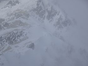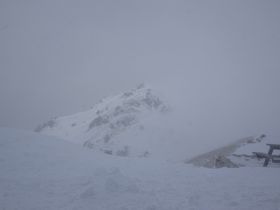 ガスって見えませんでしたが、一瞬燕山荘が見えました。夏道は、右側を巻いて小屋を目指しますが、雪道は直登なんだ・・・去年のYoutube映像で、小屋下は直登と知っていたけれど、実際に見て「これかぁ〜!」と思いました。