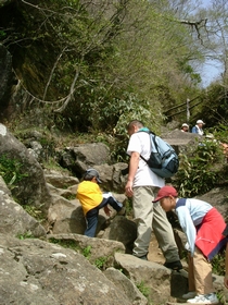 この山はファミリー登山にお勧めです。結構登りは斜度があるのですが、小学校就学前の小さな子供たちも一生懸命登っています。赤ちゃんを組み紐で縛って登っているタフなお父さんもいました。登山は登りより下りが危険。でもロープウェイ、ケーブルカーがあるので、疲れても乗り物で下山できるというのが人気の理由なのでしょう。