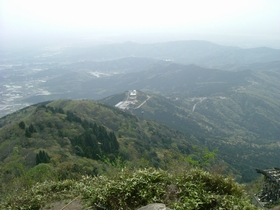 9:20 あそこの駐車場から登ってきました。ファミリー登山の山頂にしては狭くて、石がツルツル状態で危険です。でも見晴らしはサイコー。360度見渡せます。怪しい新興宗教チックな方々にも遭遇です。