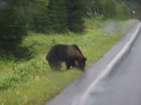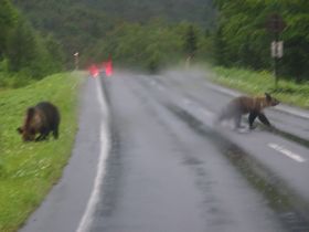 子グマ2頭が、道の右側へ・・・。写真を撮ろうと車を停めていたら、右に行った子クマが車の方に寄ってきそうな素振りを見せたので、クラクションを鳴らして逃げました。車と言えど、怖かった~!!